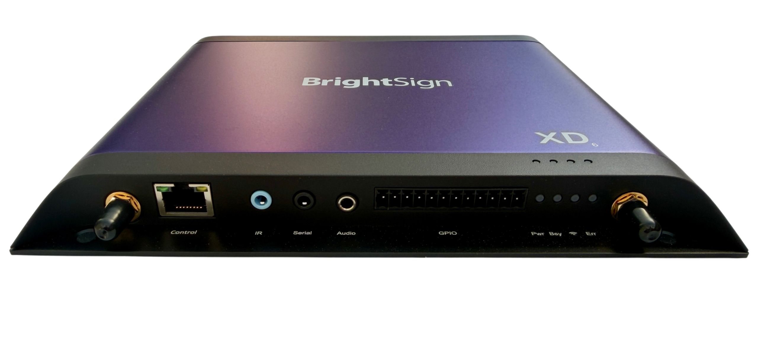 BrightSignOS enabled media player. Dual UHD video decode. PoE+. GPIO, Analog/SPDIF Audio output. microSD or SSD storage options. WiFi and Cellular connectivity options